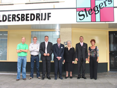 Maar die loondienstverhouding zou ophouden op het moment dat hij het bedrijf zou kunnen overnemen. En dat was in 1955. Al snel verkaste hij dat bedrijf vanaf Nuenen naar de Slegersstraat in Mierlo-Hout. Vanaf de Slegersstraat verhuisde schildersbedrijf Slegers naar de toenmalige Helmondseweg, welke later de naam Mierloseweg kreeg. Daar werd het ouderlijke huis van Mien Remmen betrokken, de echtgenote van Toon Slegers. In 1963 werd daar een nieuw pand gebouwd. En de winkel in verf, behang, speelgoed en vuurwerk was een feit. De tweede generatie Slegers kwam in 1982 toen de zonen Peter en Gerry de zaak overnamen. Ook toen werd aan de Mierloseweg de oude werkplaats afgebroken en een nieuwe gebouwd. Het was ook het tijdperk van isolatieglas en ook dat gat in de markt werd voortvarend aangepakt. Maar Gerry maakte van zijn hobbymatige spuiten zijn beroep en in de werkplaats werd een professionele spuitinrichting gebouwd. En die industriële spuiterij groeide uit haar voegen en paste niet meer in een woonomgeving. Het was dan ook in 1999 toen de spuiterij verplaatst werd naar het industrieterrein. En om de moderne ontwikkelingen te volgen en om aan een vraag in de markt te voldoen werd er een flinke uitbreiding gedaan om poedercoatingwerk te kunnen leveren. Het schildersbedrijf zal ook op termijn samengevoegd worden met het industriële spuit- en poedercoatbedrijf. Maar we zijn dan intussen ook al in het jaar 2000 aanbeland als zoon Ton van Peter en Lisan na een gedegen opleiding in de zaak komt. De derde generatie was een feit en in 2002 komt ook zoon Riny de derde generatie versterken. En die derde generatie vond een evenwichtige verdeling in zowel het schilders- als het spuit/poederbedrijf. En bij dit alles past natuurlijk een felicitatie.