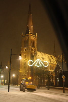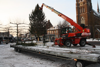 Want men maakt zich op voor het naderend kerstfeest. Het is nog maar slechts enkele weken en we zitten dan midden in de tijd welke moet doorgaan als het feest van sfeer en gezelligheid. Op het plein is men druk bezig de kerstboom op te zetten. Onder deze omstandigheden een echt 'koud' kunstje. Hangend in de takel van de kraan moet de metershoge Belgische spar aan de voet passend gemaakt worden om deze precies in de ondergrondse uitsparing te kunnen verankeren. En als hij dan eenmaal staat kan het optuigen beginnen. Vele meters snoer met daaraan steeds weer verkleurende lampen maken de boom tot een sfeervol middelpunt. En als je dan, vooral in de avond, nog eens gaat kijken dan proef je de sfeer.