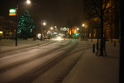 Over een wit sneeuwdek over de weg de feestverlichting met als middelpunt de kerstboom, dan heb je kerstmis al een beetje te pakken.