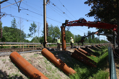Aan de spoorzijde van zowel de Houtse Parallelweg als de Noord Parallelweg wordt gewerkt aan een stevig fundament waarop de betonnen geluidswal later zal gaan rusten. Eerst zijn alle kabels opgegraven en gebundeld in mantelpijpen die straks weer een plaats krijgen. Want nu moet er ruimte zijn voor het met grote precisie in de grond boren van honderden, drie meter lange stalen kokers. Deze vormen het fundament. Straks opgevuld met beton en vastgemaakt dik betonijzer is dat de basis voor 'de geluidswal'. En de aannemer gaf te kennen dat hij nog maanden bezig zal zijn om deze grote klus te klaren. Wij blijven het werk in elk geval volgen want het uiteindelijke resultaat zal het gezicht in en om het spoor erg veel veranderen.