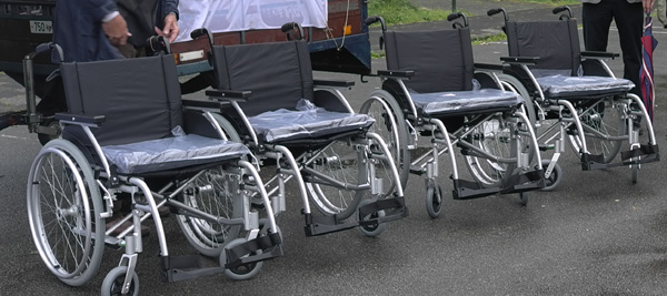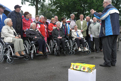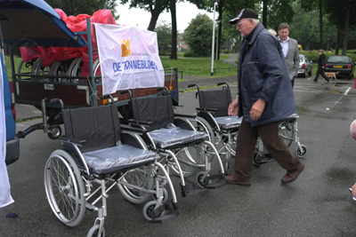 Aan het begin van de 43e boemeltocht van de Zonnebloem, vorige week woensdag 6 juni, was er een kleine officiële bijeenkomst op de parkeerplaats van het voetbalveld. De wijkraad had uit het fonds Vogelaargelden een bedrag toegekend waardoor het mogelijk was 9 nieuwe rolstoelen aan te schaffen. Het bestuur van de Zonnebloem had een zorgvuldige keuze gemaakt uit het aanbod van rolstoelen van de firma Ligtvoet.